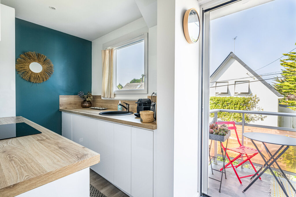 Un appartement rénové avec soin en 2021, situé au 1er étage d’une résidence calme, sur une voie privée à seulement 2 minutes à pied de la plage du Men Du.