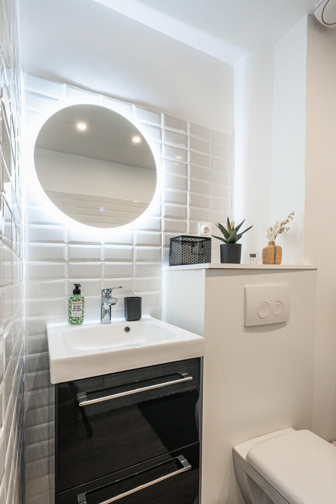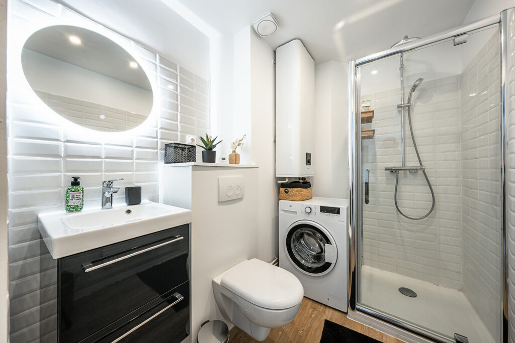 - Salle d’eau moderne avec douche, WC suspendu, sèche-serviette et machine à laver.